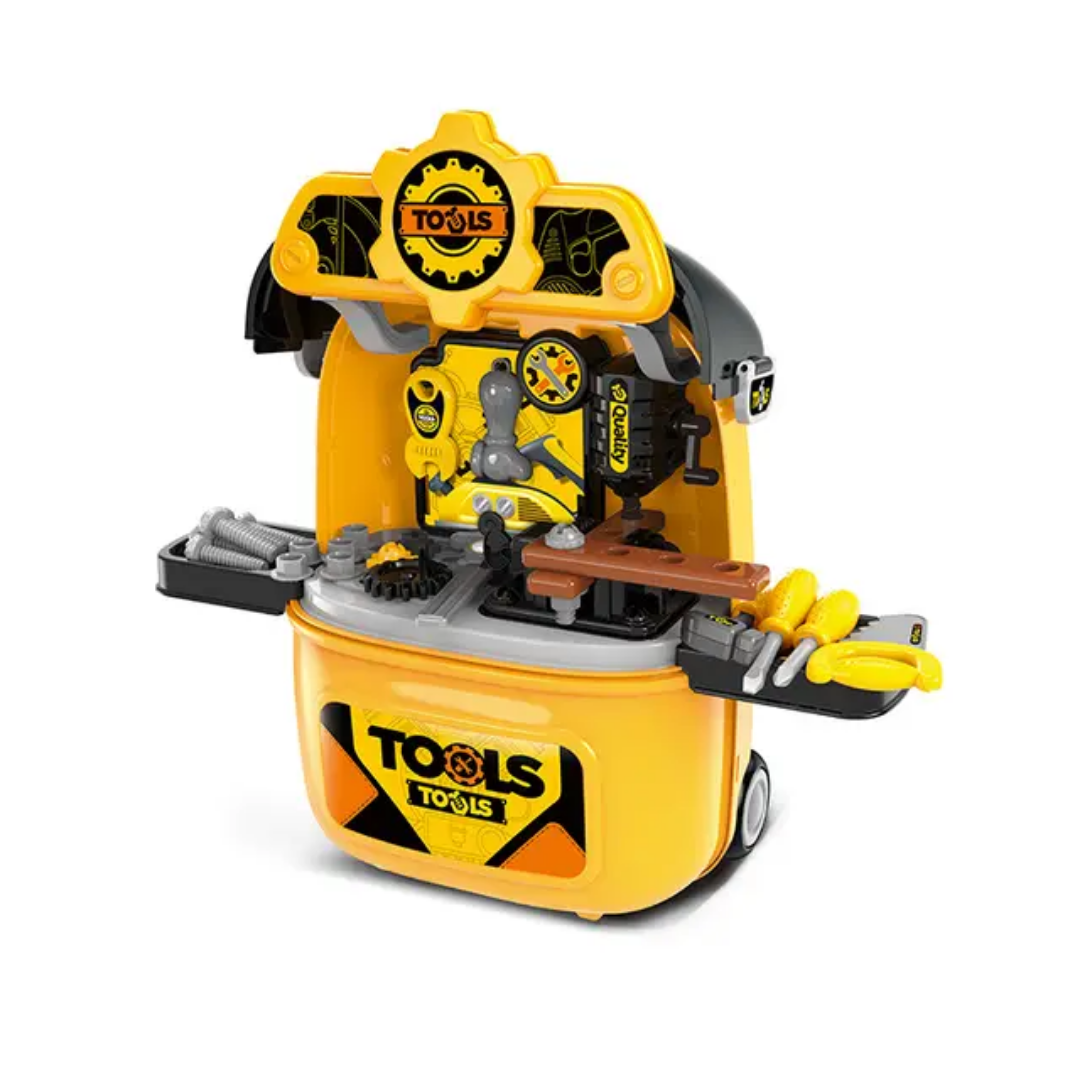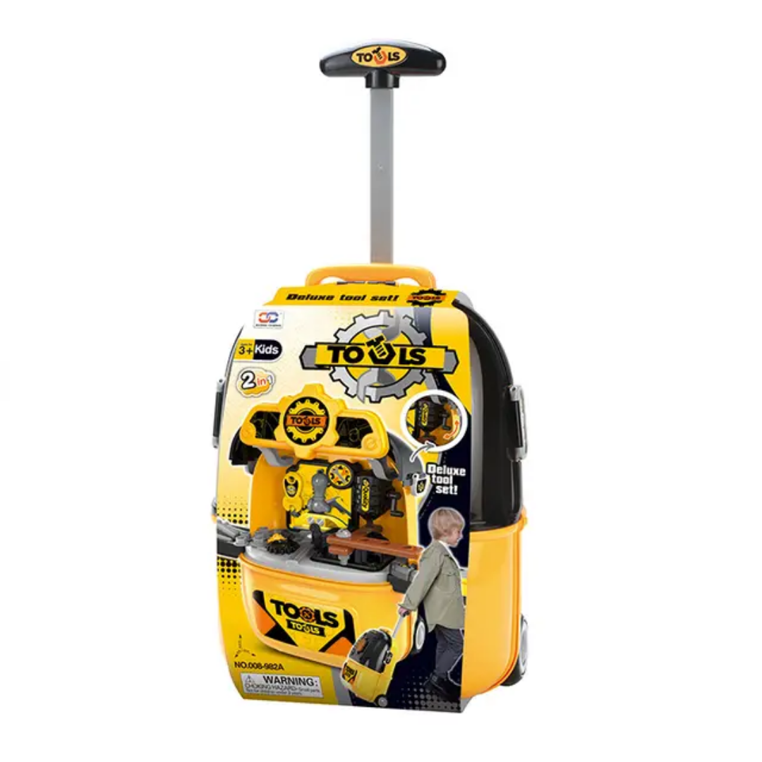 Encourage your little one’s creativity and motor skills with this portable 2-in-1 tool workshop! This vibrant yellow play set easily transforms from a rolling travel suitcase with an adjustable handle into a fully equipped workbench, allowing kids to take their “repairs” anywhere they go.