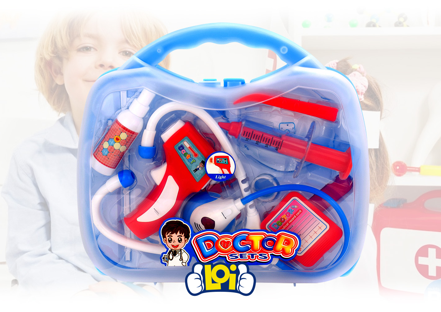 Light-Up Thermometer: A realistic-looking, battery-operated thermometer (the red gun-style tool) that adds excitement to checking a patient’s temperature.