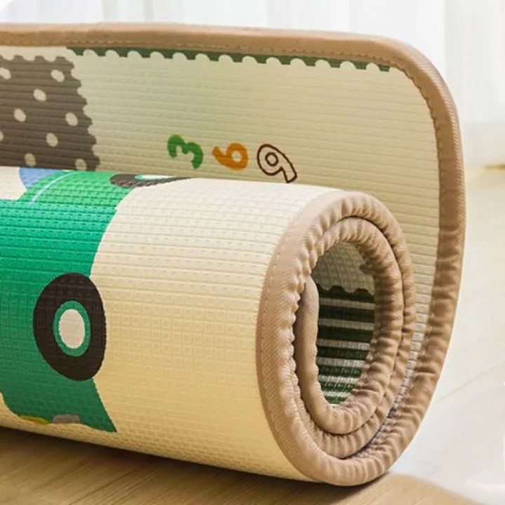 • রিভার্সিবল ডিজাইন (দুই পাশে ব্যবহারযোগ্য): ম্যাটের উভয় পাশেই ভিন্ন ভিন্ন আকর্ষণীয় ডিজাইন রয়েছে। একপাশে থাকে রঙিন কার্টুন চরিত্র বা অক্ষর, যা শিশুর কগনিটিভ বিকাশ এবং রঙ চেনার ক্ষমতা বাড়ায়। অন্যপাশে শান্ত ডিজাইন বা রোড ম্যাপ থাকতে পারে, যা বিভিন্ন থিমের খেলার জন্য উপযুক্ত।