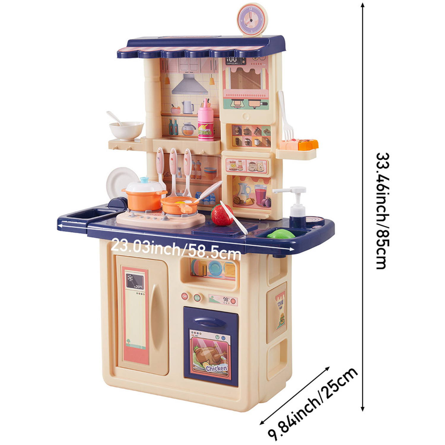 রিয়েলিস্টিক ডিজাইন: কিচেনটির ওপরের অংশে রয়েছে ঘড়ি এবং কিচেন কেবিনেটের ছবি, যা দেখতে একদম আসল কিচেনের মতো। এটি শিশুদের বাস্তবের কাজের প্রতি আগ্রহী করে তোলে।