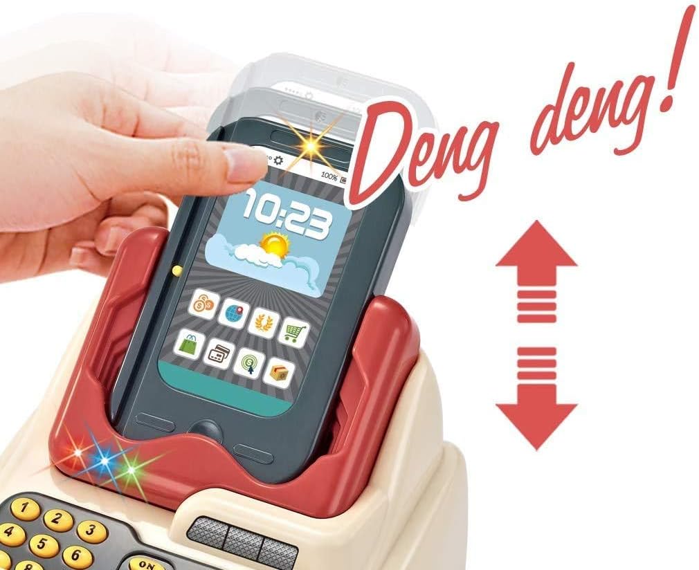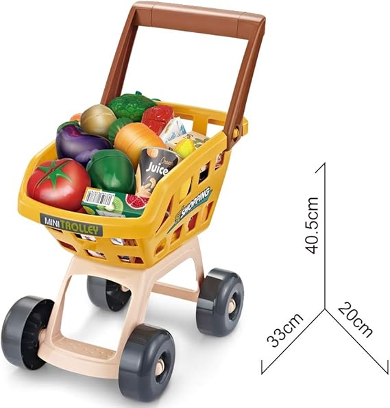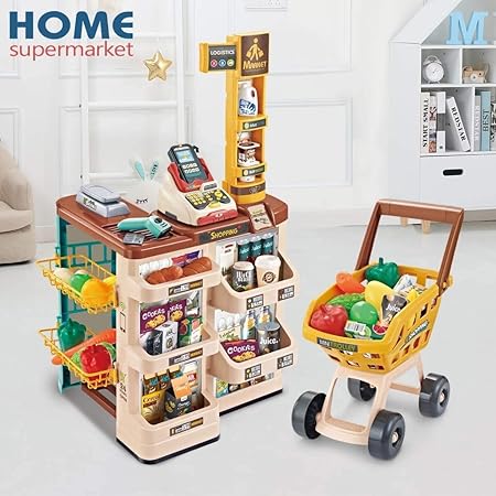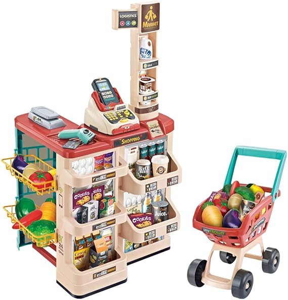 This is a fun and interactive supermarket playset for kids, featuring a checkout counter with a cash register, a scanner, and a shopping cart. The set includes a variety of play food items, encouraging imaginative role-playing and hands-on learning.