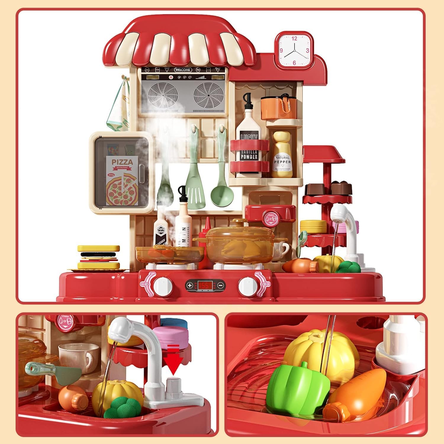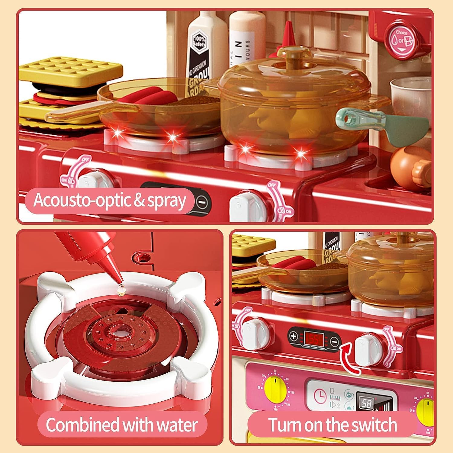 The Interactive Spray Kitchen Play Set offers a highly engaging and realistic cooking experience for young children. This model comes with a total of 48 accessories, which include pots, pans, utensils, and a wide variety of play food items (pizza, seasonings, meats, vegetables).