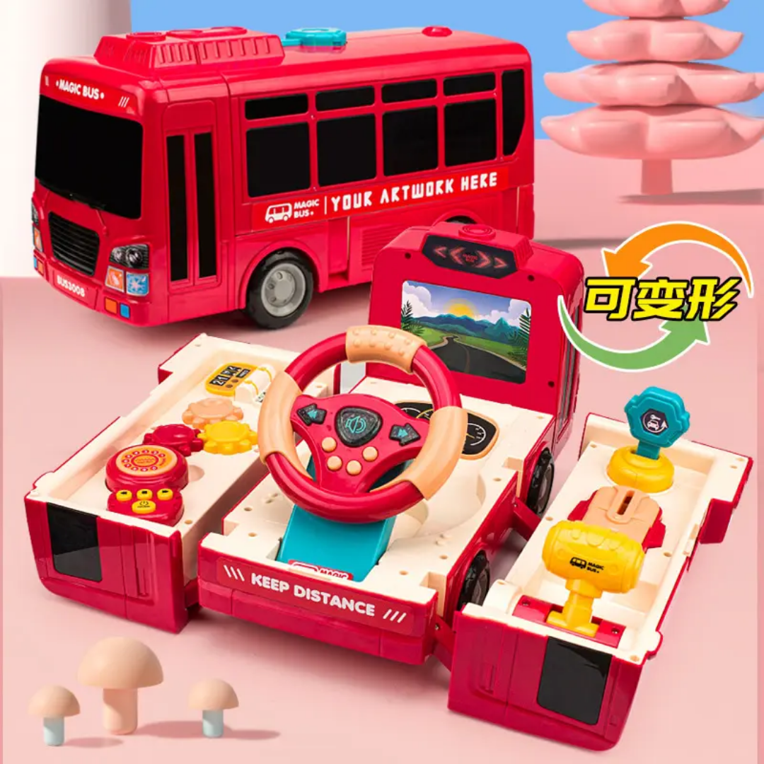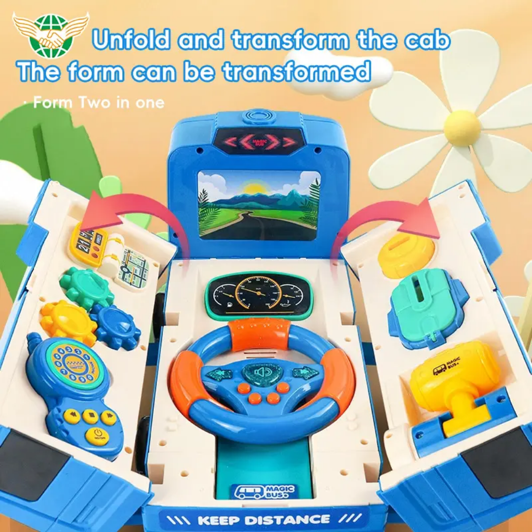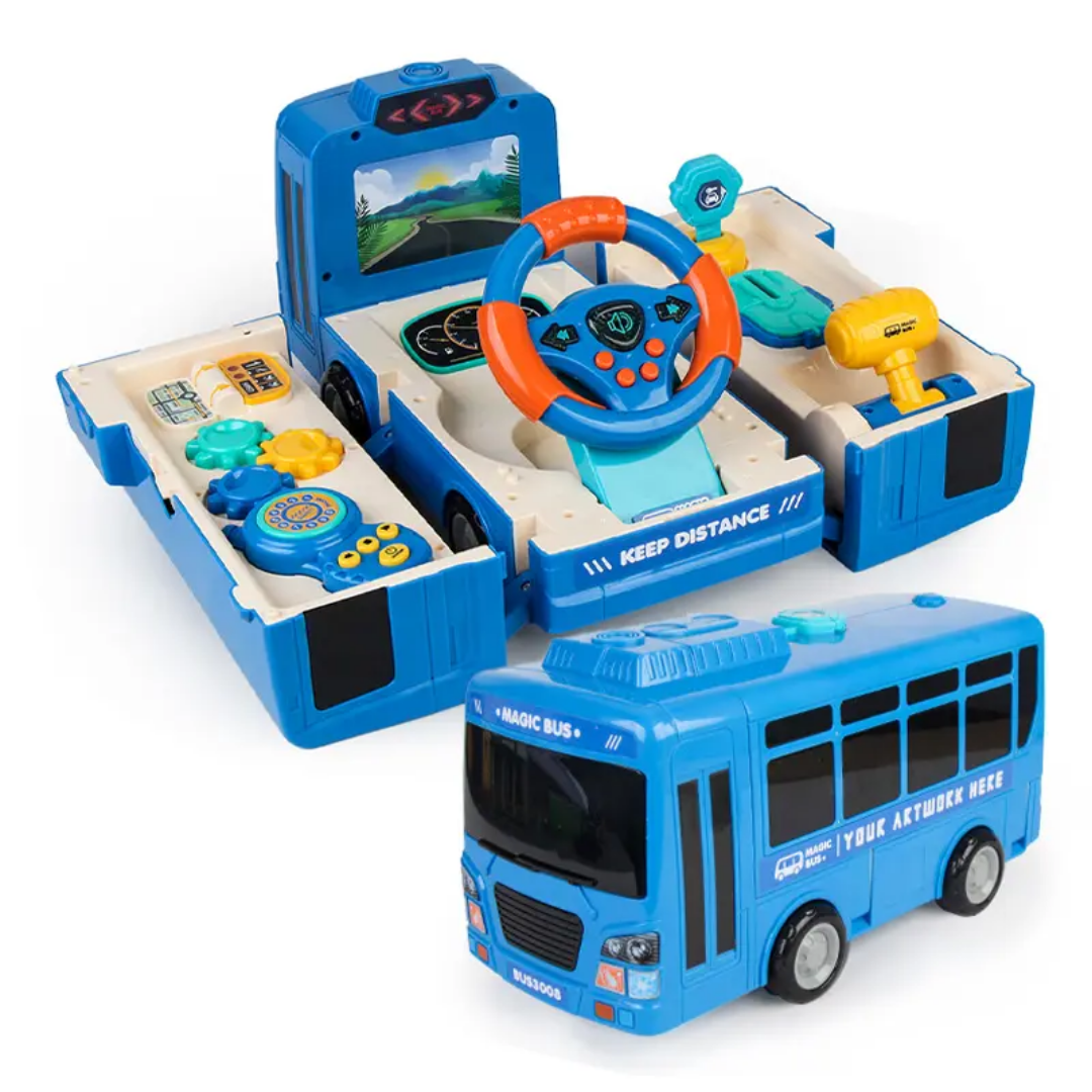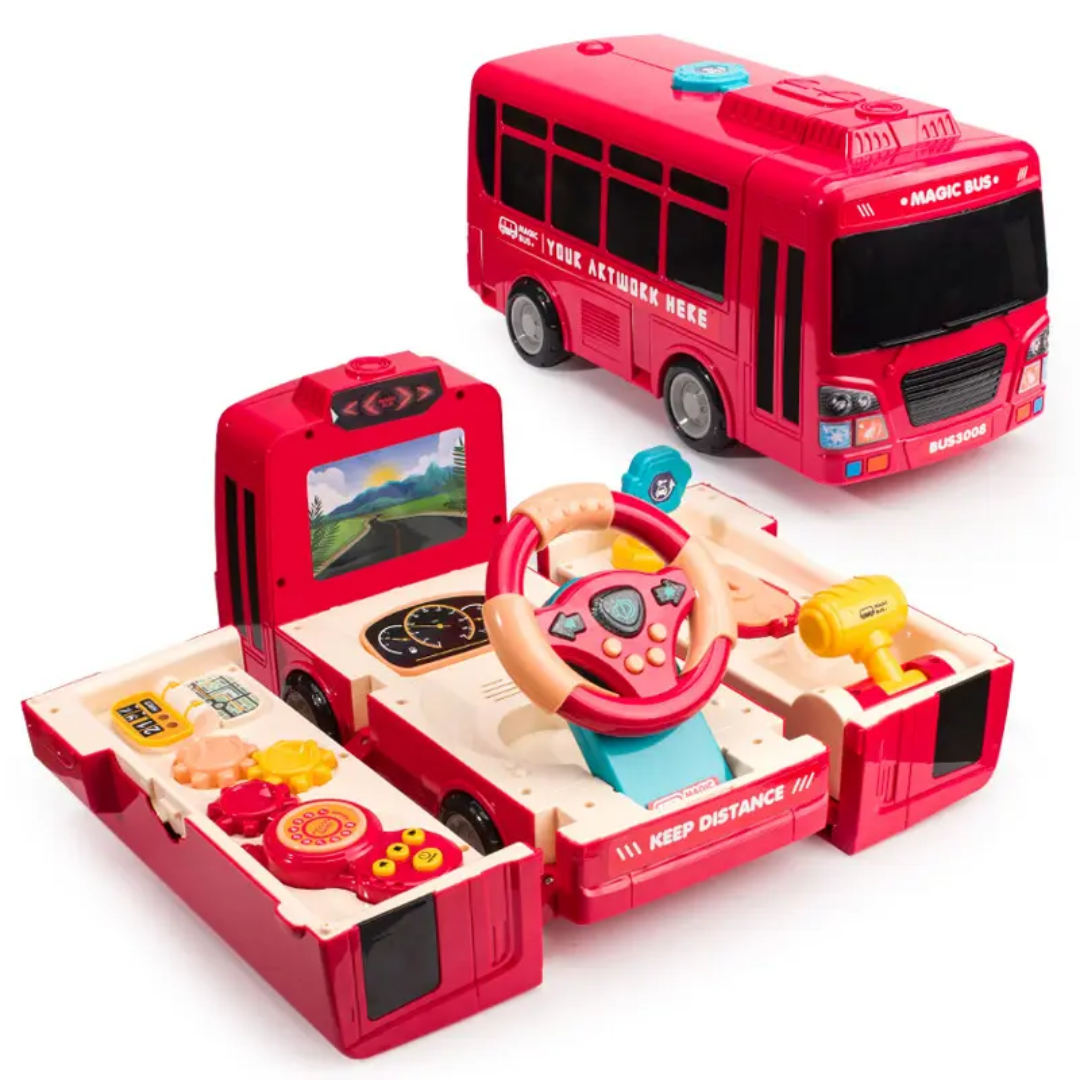 From Transit to Training Bring the excitement of the road home with the Transforming Driving Simulator Bus. This innovative toy features a unique fold-out design: it functions as a rolling school bus one moment and opens up into a full dashboard simulator the next.