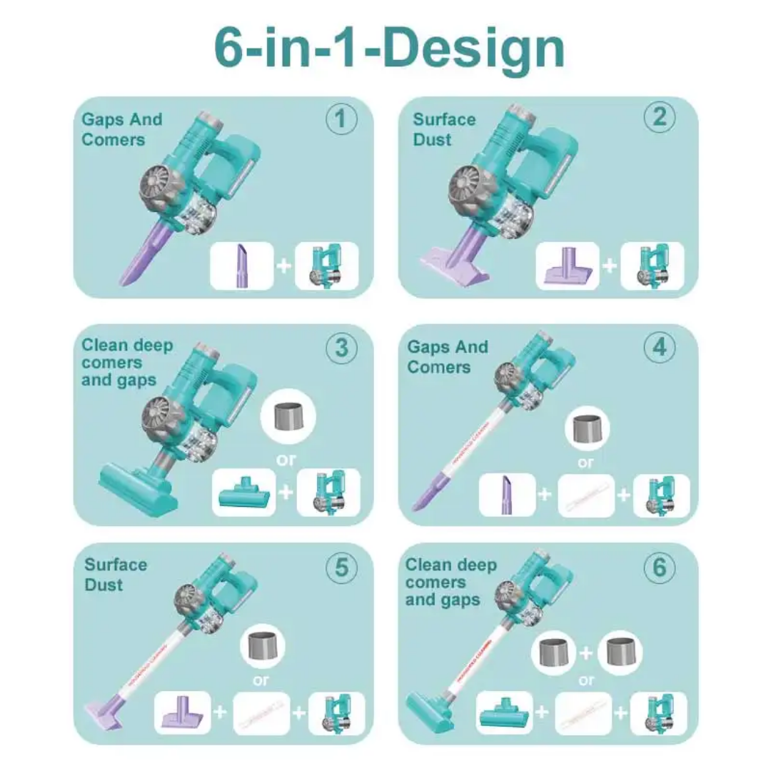 Interchangeable Attachments: Comes with multiple nozzle and brush attachments, allowing kids to practice cleaning different “surfaces” and enhancing problem-solving skills.
