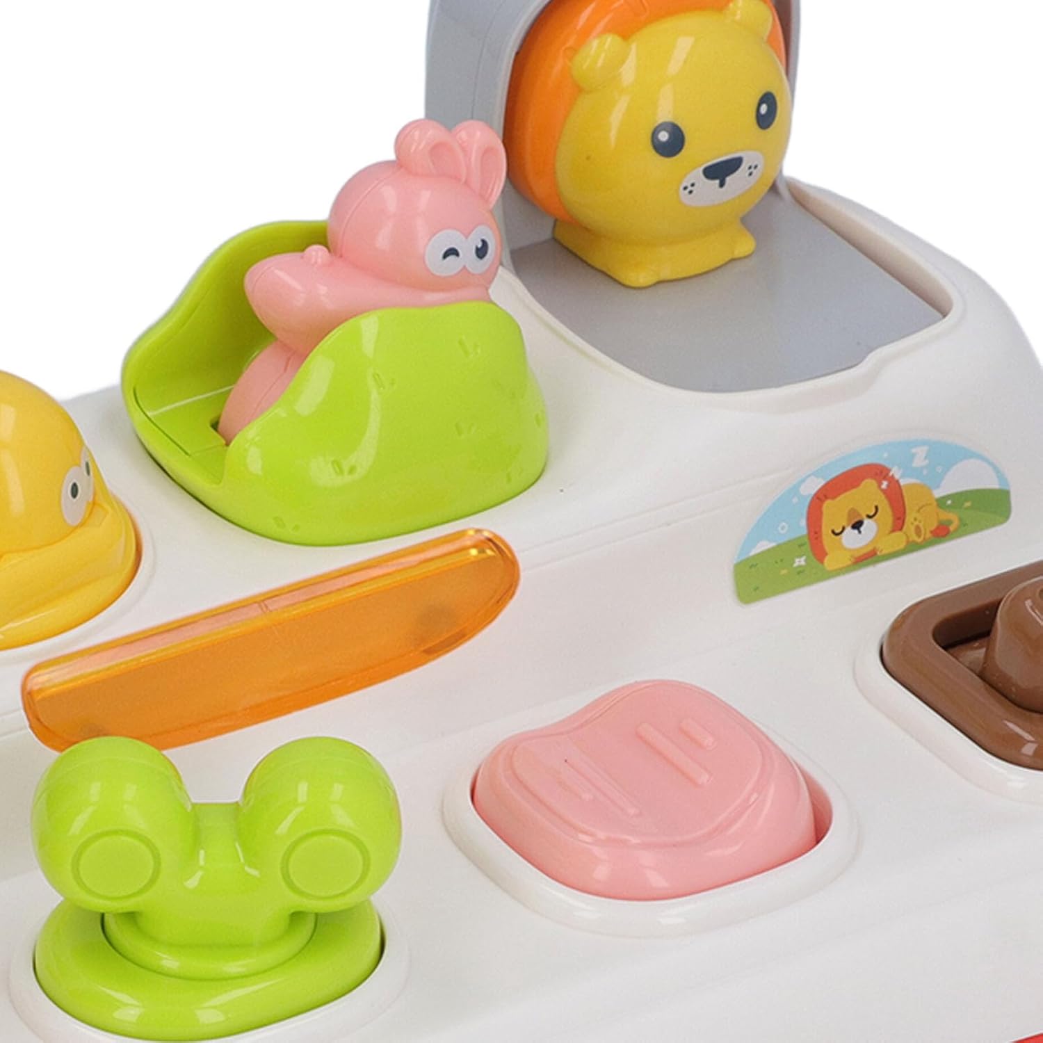 Each of the four colorful buttons requires a different action to trigger a surprise: push, turn, slide, or flip. When the action is completed correctly, a cute zoo animal pops out of its hiding spot with a friendly smile! This helps children understand the concept of cause and effect while refining their hand-eye coordination.